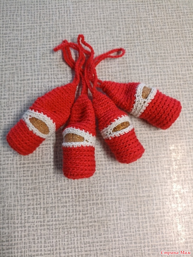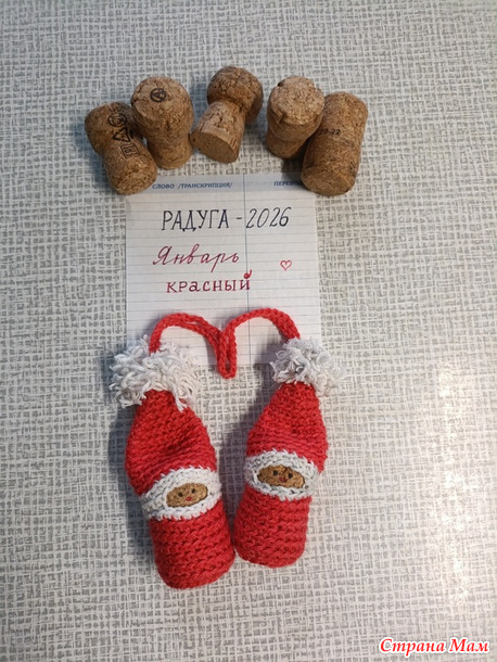 В декабре 2022 года в игре Домовёнок Таня-Танечка-Танюша https://www.spletenie.ru/users/tanja-tanechka-tanjusha/diets/ в отчёте показала своих очаровательных мини-Сант https://www.stranamam.ru/post/15019268/. Мне они так понравились, что захомячила описание в избранное и стала собирать пробки от шампанского. Но шампанское мы как-то не часто пьём, а вот в этот Новый год было много мероприятий, где я и набрала нужных мне пробок.