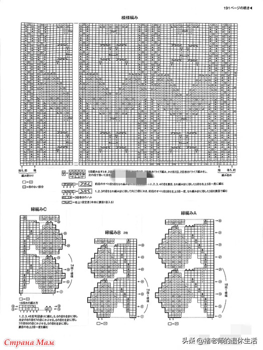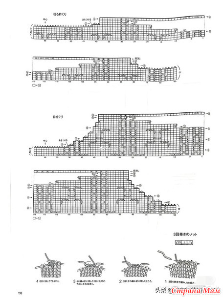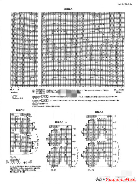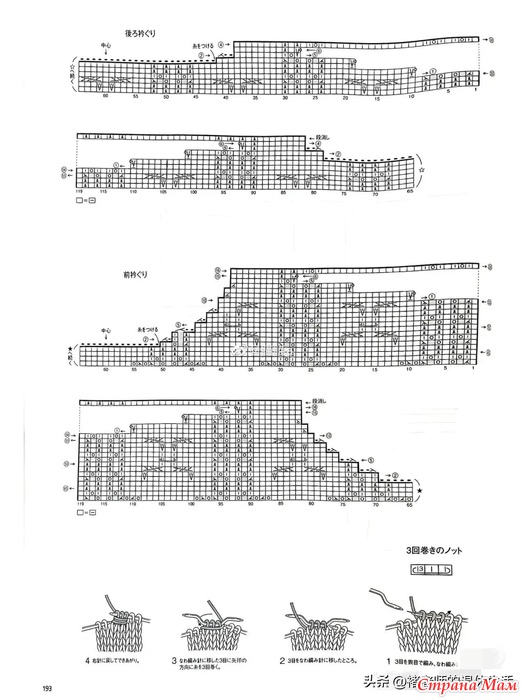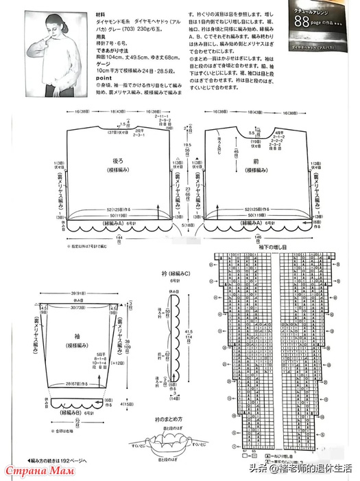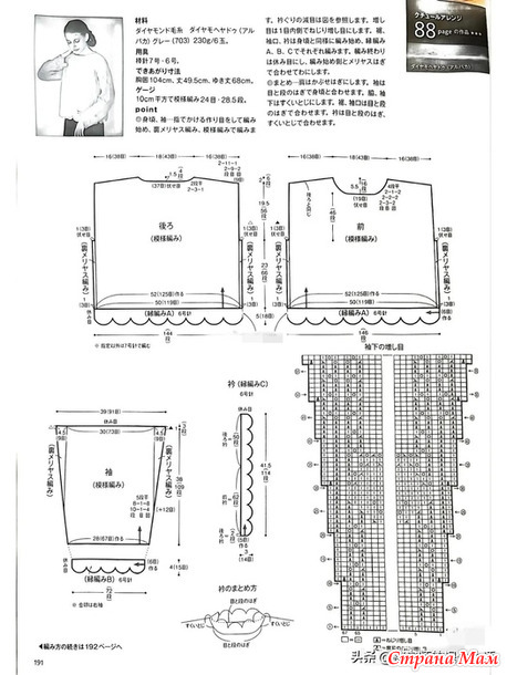 Обратитесь к схеме для уменьшения выреза горловины. Для увеличения скрутите одну петлю внутрь. Начните вязать нижний край, манжеты и воротник так же, как и основную часть изделия, и провяжите края A, B и C соответственно. Сделайте перерыв в конце вязания и соедините начальную сторону лицевой гладью, чтобы сделать нижний край.