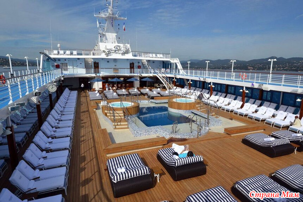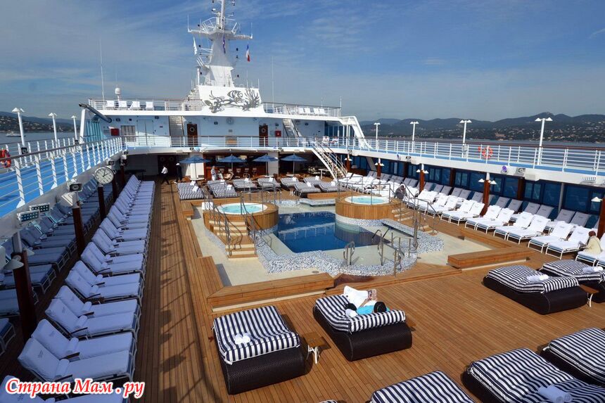 На верхней палубе расположен маленький бассейн и удобные лежаки
