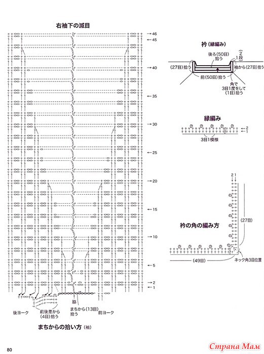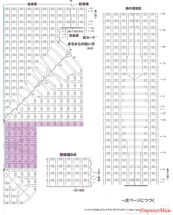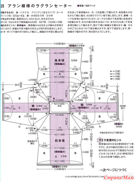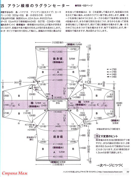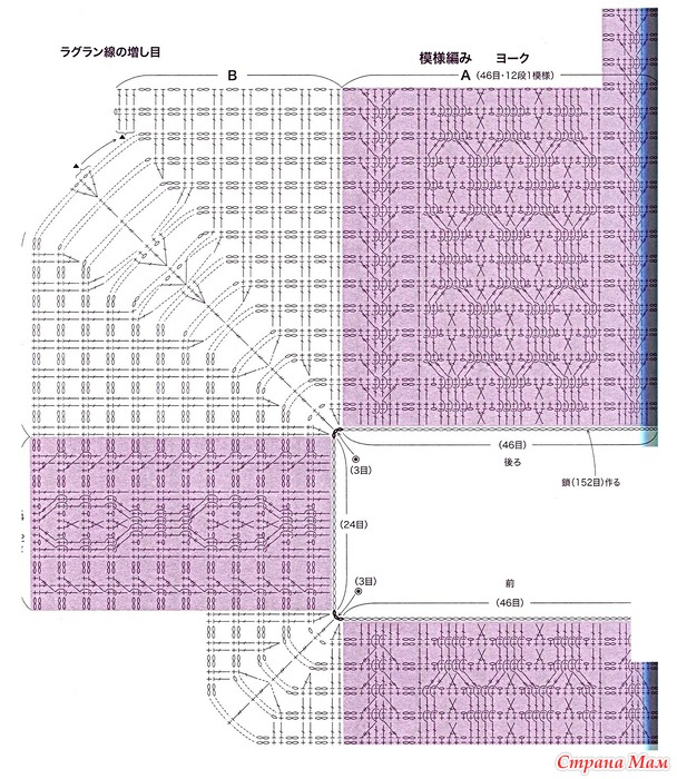 Возьмите книгу и провяжите узорные петли A, B и C. Меняйте направление вязания в каждом ряду и вяжите по кругу, прибавляя петли по четырем линиям реглана. Основная часть: Разделите кокетку на четыре части: основную часть и рукава, и продолжайте от кокетки вязать четыре ряда разных петель на спинке, создавая разницу между передней и задней частью. Добавьте 12 воздушных петель с обеих сторон клина, затем поднимите петли с клина и вяжите переднюю и заднюю части основной части по кругу. Продолжайте вязать кайму по низу. Рукава: Присоедините нить к середине клина и провяжите рукава, но убавляйте петли под рукавами. Воротник: Свяжите кайму, но сделайте углы, как показано на схеме.