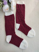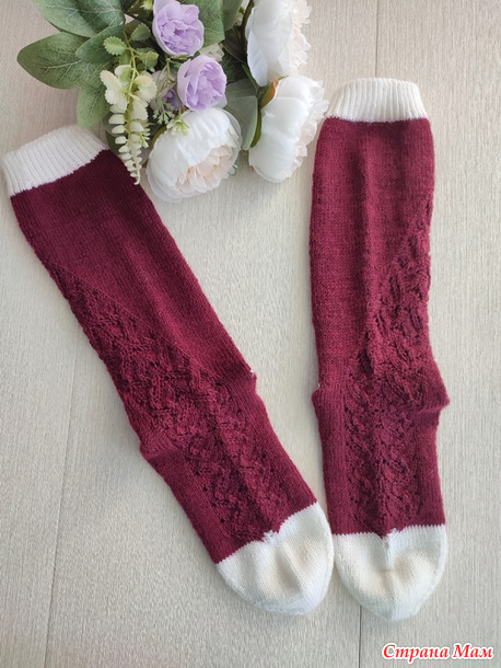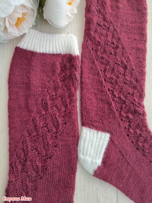 Носки с высоким паголенком, почти гольфы. По паголенку идёт ажурный узор, который обвивает ногу и спускается по верху стопы к мыску.
