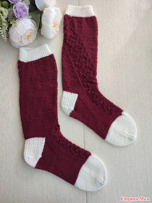 Бордовую пряжу использовала всю без остатка. Ее было 80 гр, а вес готовых носочков - 100 гр. Так что очень точно вписалась в разрешённое процентное соотношение.
