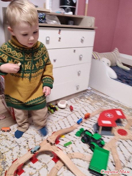 Егорушке подарили деревянную железную дорогу, теперь это его любимая игрушка. Как только я прихожу к ним в гости, он меня зовёт играть: "Баба, игать тутуку!"