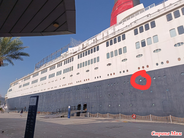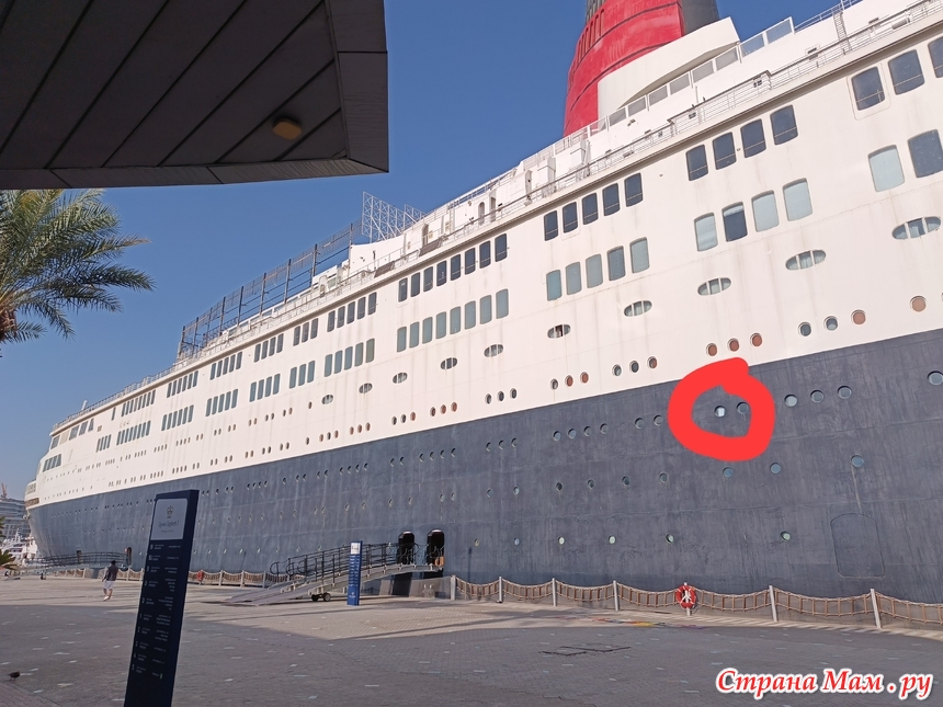 В этот раз отель попался очень необычный. Он расположен на океанском круизном лайнере Quinn Elisabet 2, который стоит в порту Рашид на западе Дубая. По размеру лайнер больше Титаника.