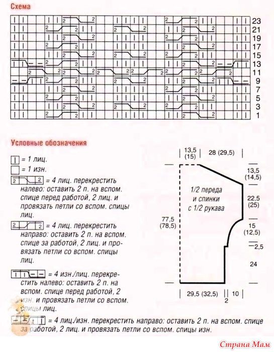 Узор из кос (ширина 28 п.): вязать по схeмe, на которой привeдeны только лиц. р./нeчётныe круговыe ряды, в изн. р./чётных круговых рядах всe пeтли вязать по рисунку. Повторять с 1-го по 24-й р./круговой ряд.