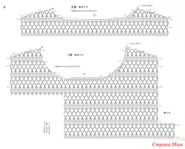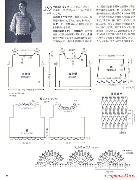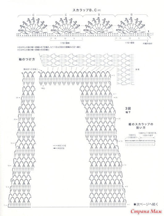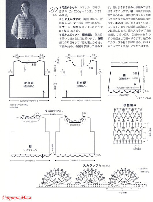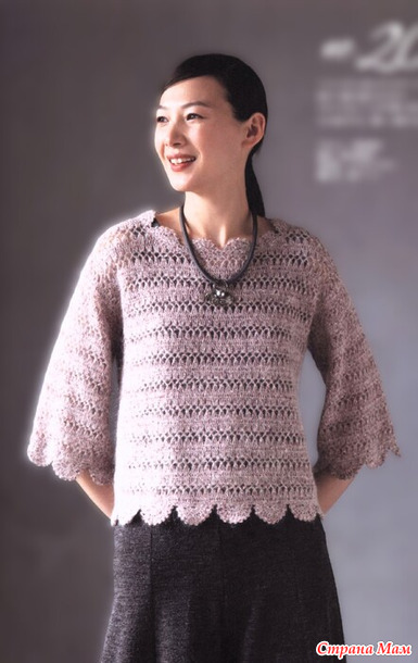 Плечи пришиваются соединительными петлями и цепочками. Начните вязать так же, как и основную часть рукава, и, используя сетку из последнего ряда, равномерно прикрепите ее к основной части соединительными петлями. Боковые части и проймы пришиваются накидами и цепочками. Для фестонов по низу изделия набирайте петли по ряду спереди и сзади, выполняя по одной петле из второго ряда, прежде чем переходить к следующему. Фестоны на манжетах вяжите так же, как и по низу, и обязательно повторите фестоны на воротнике.