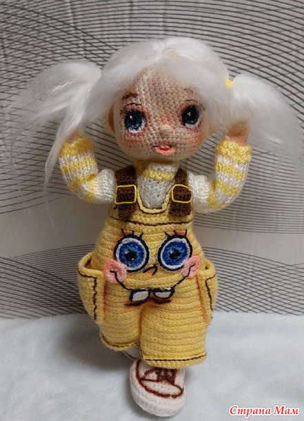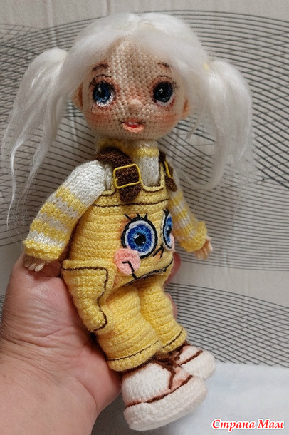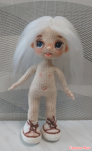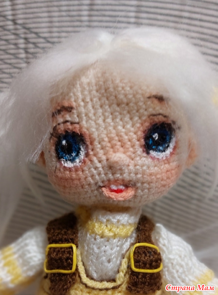 Хочу показать вам мою очередную куколку.Связана она по МК Светланы Власовой.Куколка не большая-22см . Проволочный каркас только в руках. Голова поворотная. В этот раз я впервые делала паричок . В его основе-шапочка из влажных салфеточек. И волосы из пряжи..Расчёсано-вычесанной пряжи. Это то же я делала первый раз. Не совсем понравился эот способ делать прядочки,так как ну очень большой отход пряжи.и длина прядок меньше получилась почти в два раза.. Хотя сами волосики понравились в результате.. Но для себя решила,что в следующий раз возьму просто пряжу для валяния.Думаю результат будет не хуже.А вот шапочку такую для паричка мне очень понравилось делать. возьму себе на заметочку как вариант..