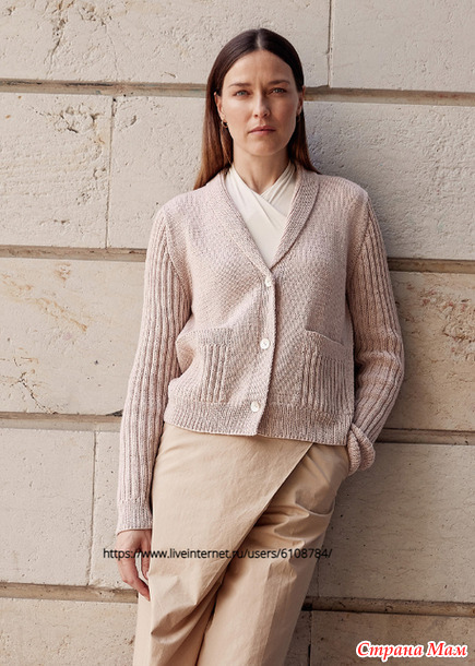 Вам потребуется: пряжа Lana Grossa Cool Wool Seta (80% шерсти мерино экстрафайн, 20% шелка, 160 м/50 г) – 9 (10) 11 мотков светло-розовой (цв. 2010); cпицы № 2,5 и 3; 3 пуговицы диаметром 20 мм.