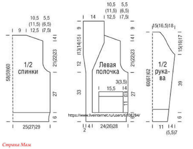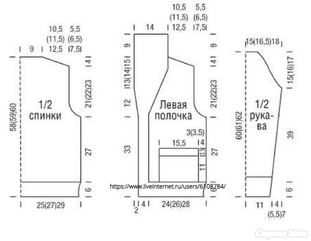 1. На спицы № 2,5 набрать для каждого рукава по 69 п. и в 1-м р. (= изн. ряд) распределить петли, как на спинке.