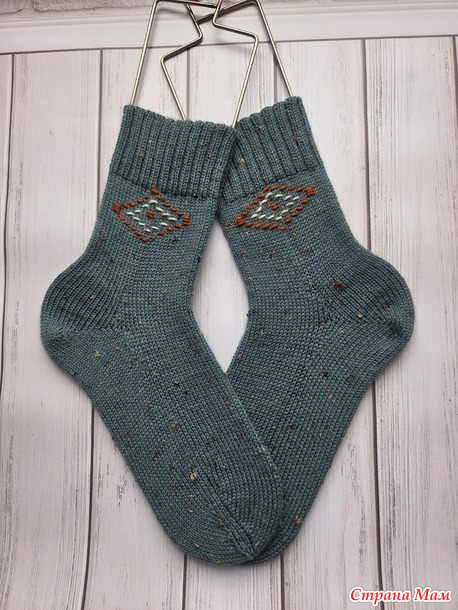 Зелёные носки с вышивкой. Имитация эстонского вязания Roosimine.