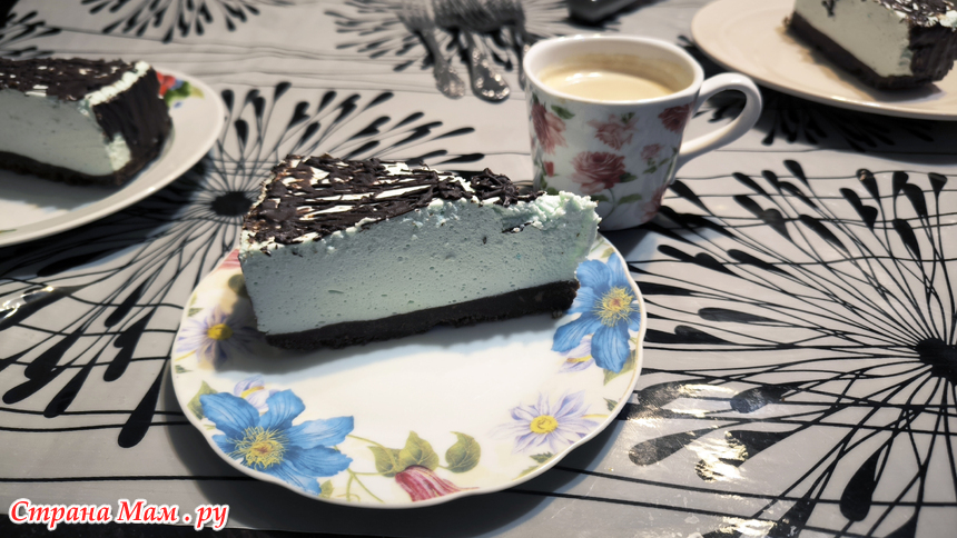 В этот раз у меня в торте было 2 банки сметаны 20% («Простоквашино») по 300 гр. и примерно 500 гр. развесного сыра, сахара взяла чуть больше 150 гр, дополнила мятным сиропом.