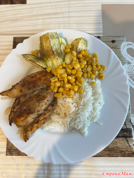Ещё куриные грудки жарила, к ним рис, кабачки и кукуруза.