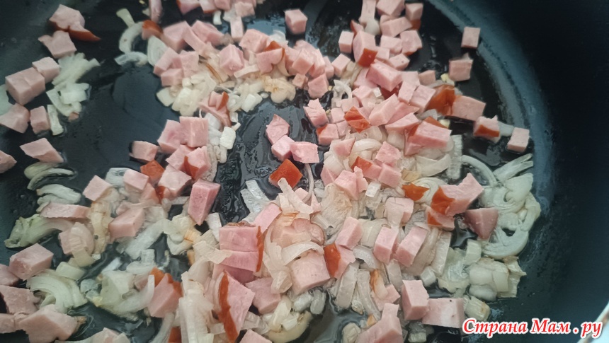 Когда овощи будут практически готовы добавляем лук с копченостями в кастрюлю.