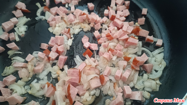 Когда лук станет золотистым, порезанные кружочками или полукружочками оставшиеся копчености У меня были окотничьи колбаски и подлясные копченые сосиски