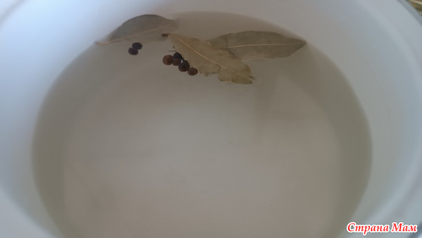 В кастрюлю с водой забрасываем душистый перец и лавровый лист. Хотите пожирнее (хотя копченности + сливочное масло по мне довольно наваристо), положите небольшой кусочек шкурки от бекона