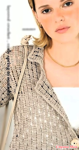 Этот вязаный крючком приталенный жакет привлекателен тем, что он полупрозрачный и не сковывает движения в плечах. Клетчатый узор создан с помощью двойных и удлиненных петель. Его можно носить как в повседневной жизни, так и с ноткой элегантности. Он создает непринужденную атмосферу.