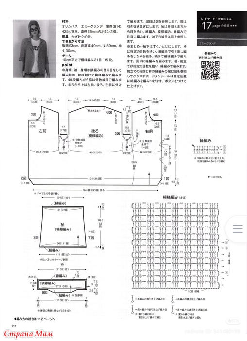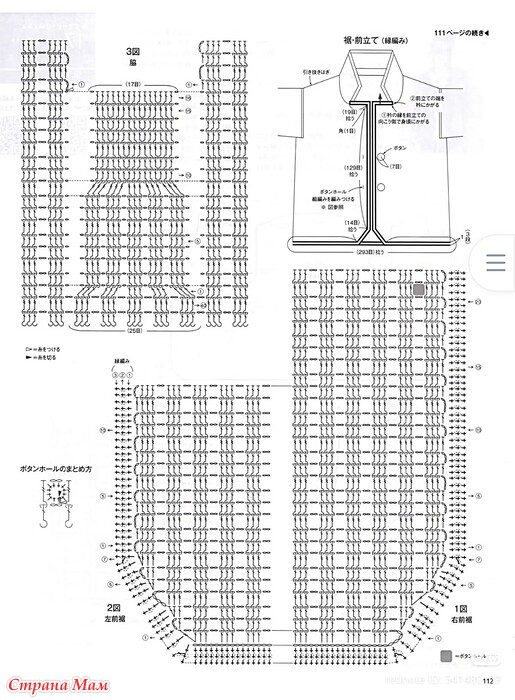 ●Завершение: Сшейте изнаночную сторону рукавов свободным швом. Для воротника наберите указанное количество петель и провяжите столбиками без накида, затем продолжайте вязать узорчатой ​​лицевой гладью. Обвяжите кайму по краю. Для подола и планки наберите указанное количество петель и обвяжите каймой.