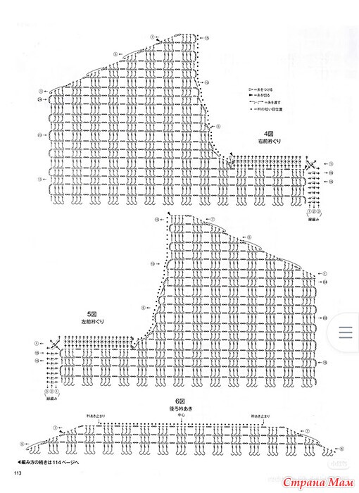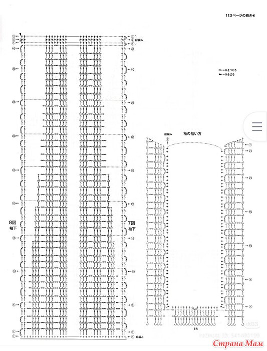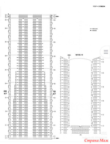 Обратитесь к схеме для убавления петель. Сшейте потайной шов на плечах. Для рукавов наберите петли с основной части и клина и вяжите туда-обратно, используя столбики без накида, узорчатые столбики и кайму. Обратитесь к схеме для убавления петель под рукавами.
