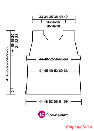 Передняя часть: Наберите такое же количество петель, как и для спинки, и вяжите так же, как и для спинки, пока длина изделия не достигнет 42 (43) 44 (46) 47 (48) см. Не забудьте про мерный наконечник. Теперь снимите 22 центральные петли на нить для выреза горловины. Плечи: Вяжите платочной вязкой с 3 краевыми петлями. Шнурок, как и раньше, и 1 лицевой гладью по краю горловины. После 3 или 4 рядов следующий ряд следует вязать лицевыми петлями, как и при убавлениях для выреза горловины. Не забудьте про убавления - 2, поэтому убавляйте по 1 петле каждые 2 ряда 3 (3) 3 (4) 4 (4) раза. Для каждого плеча останется 15 (16) 17 (18) 20 (22) петель. Закройте петли. Когда длина изделия достигнет 48 (50) 52 (54) 56 (58) см, не забудьте про мерный наконечник.