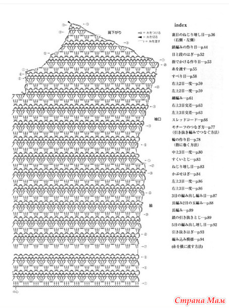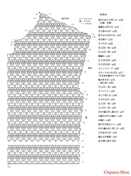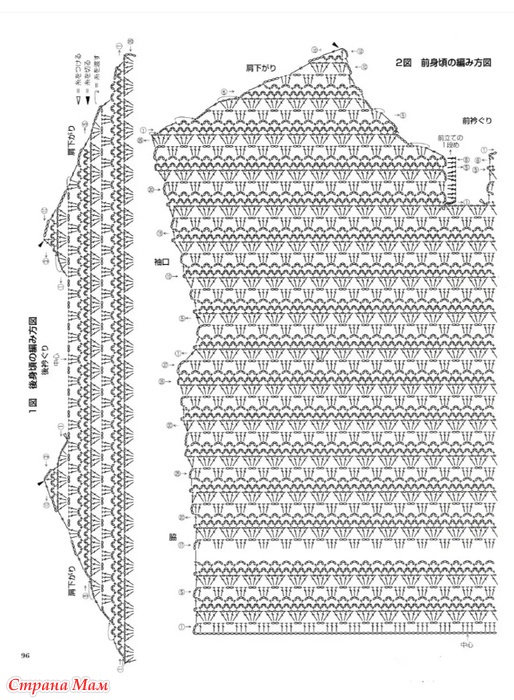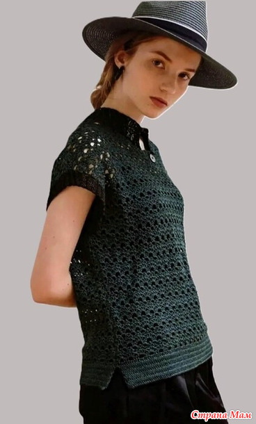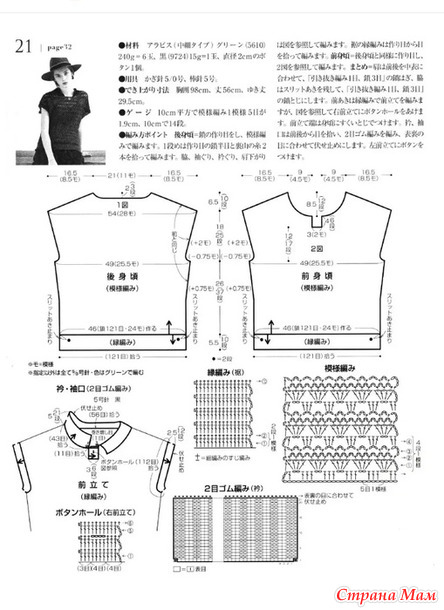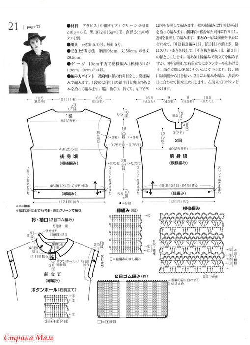 Советы по вязанию. Спинка: Наберите воздушную петлю и вяжите узором. В первом ряду поднимите полувоздушную петлю с набора петель и две нити пряжи с изнаночной стороны. Боковые части, проймы, вырез горловины, плечи.