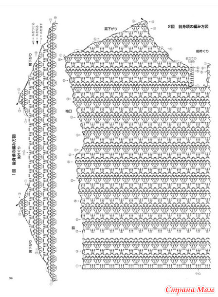Для вязания обратитесь к схеме. Для первого края наберите петли, провязанные в день вязания. Для передней части наберите петли так же, как и для задней, и обратитесь к схеме 2 для вязания. Завершение: Расположив переднюю и заднюю части друг к другу, сшейте плечи 1 соединительной петлей и 3 воздушными петлями, а для боков оставьте разрез и сшейте воздушную петлю 1 соединительной петлей и 3 воздушными петлями. Для передней застежки свяжите планку с каймой, но обратитесь к схеме, чтобы сделать петлю для пуговицы на правой планке. Прикрепите край планки к основной части с помощью стежка «лопатка». Для воротника и манжет наберите петли с передней и задней частей, сшейте резинкой 2 петли и закройте петли, совместив петли на передней и задней частях. Пришейте пуговицу к левой планке.