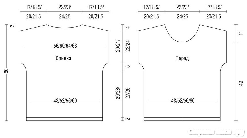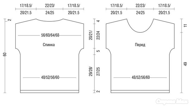 Вязать, как спинку, но с более глубокой горловиной. Для этого через 49 см от наборного ряда закрыть средние 14 (16) 18 (20) п. и для закругления горловины с обеих сторон в каждом 2-м р. 1 раз по 3 п., 2 раза по 2 п. и 3 раза по 1 п. Плечевые скосы выполнить на такой же высоте и так же, как на спинке.