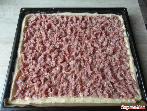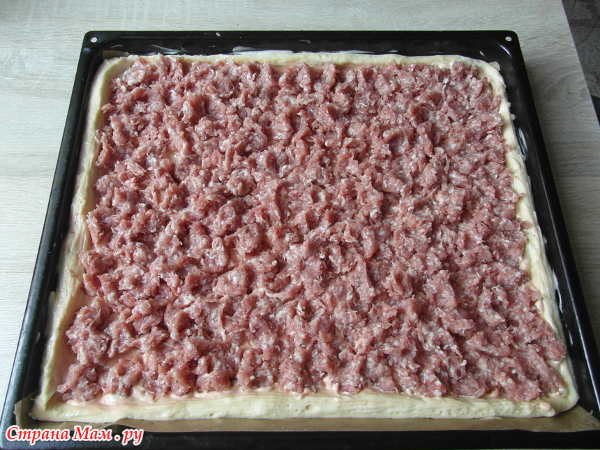 А начинка просто сырой фарш. Доводим его до вкуса специями и луком. Распределяем по тесту.