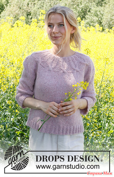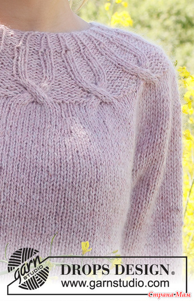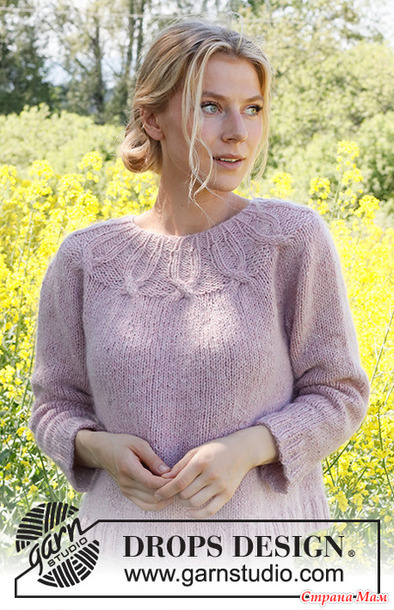 Джемпер связан из пряжи DROPS Soft Tweed и DROPS Kid-Silk сверху вниз, имеет круглую кокетку с узором из кос и рукава длиной ¾. Размеры S - XXXL
