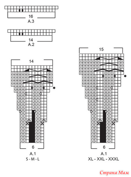 Когда вы довяжете до кругового ряда с черной звездочкой, сменить спицы на круговые размера 5,5 мм. Вязать остальные круговые ряды А.1. СЛЕДИТЬ ЗА ПЛОТНОСТЬЮ ВЯЗАНИЯ!