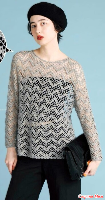 Динамичный зигзагообразный узор создается с помощью изнаночных петель в сетчатом вязании. Это вязаное крючком изделие с втачными рукавами, которые пришиваются путем создания оката рукава. Приведены схемы уменьшения проймы и выреза горловины, увеличения количества петель под рукавами и уменьшения оката рукава, так что даже те, кто хочет попробовать что-то более сложное, смогут это сделать.