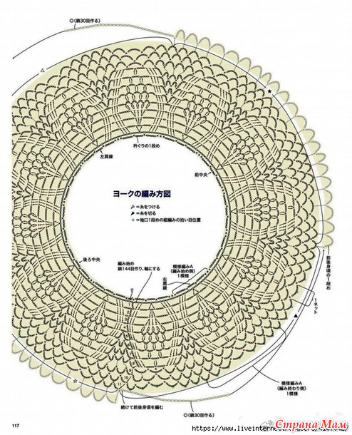1. Наберите воздушную петлю и провяжите кокетку по кругу, используя узор А.