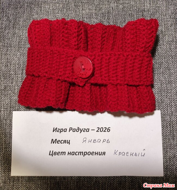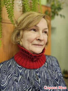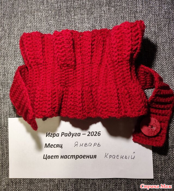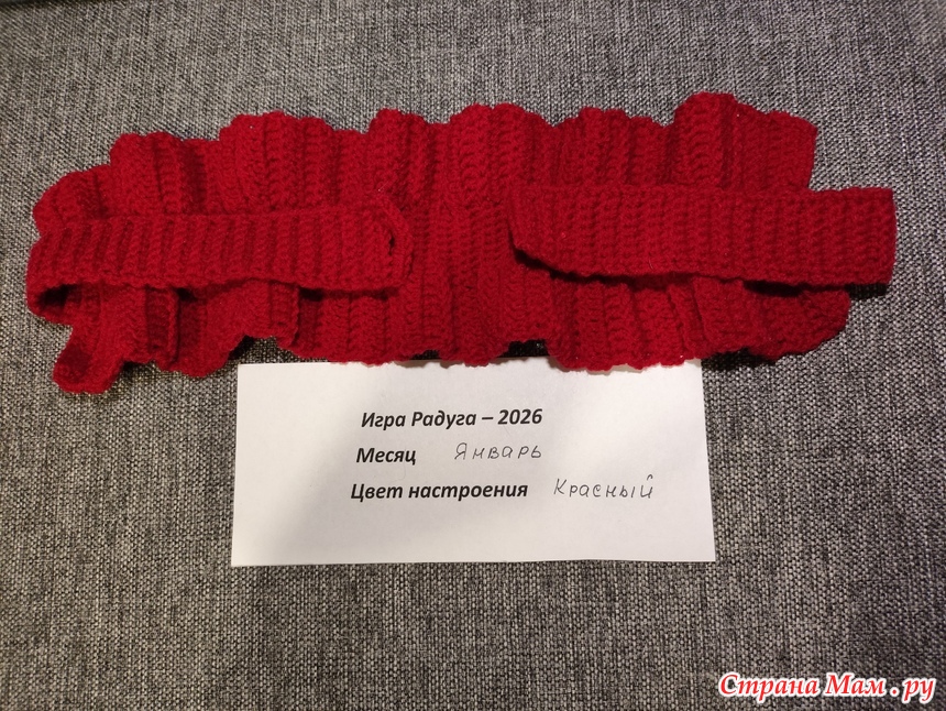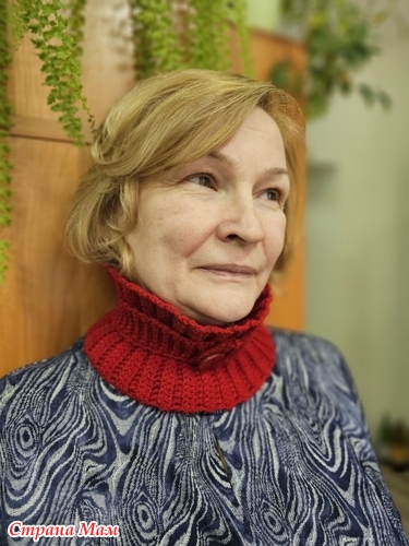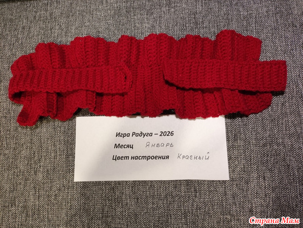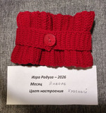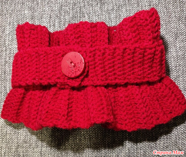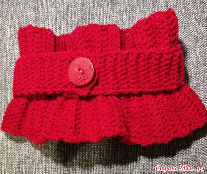 Набирала 24 петли. По краям по 8 петель столбиками с накидами за заднюю полупетлю. В центре 8 столбиков без накида тоже за заднюю полупетлю. Широкая часть вяжется на обхват шеи. Потом довязала завязки на нужную длину. Сделала петельку для пуговицы, можно и просто завязки оставить.