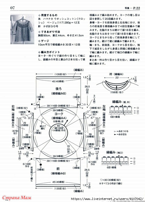 Наберите петли от горловины и вяжите в три ряда, создавая свежую, лоскутную кокетку. Эта элегантная блуза с короткими рукавами выполнена в мягком бежевом цвете, приятном на ощупь. Небольшие точечные узоры, обрамляющие воротник, нижний край и манжеты, выглядят очаровательно.