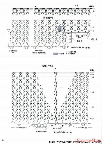 Рукава... Наберите петли с клина, разницы между передней и задней частью и кокетки, убавьте петли под рукавом и вяжите по кругу узором B, как и основную часть изделия. Продолжайте вязать по кругу край манжеты.