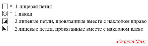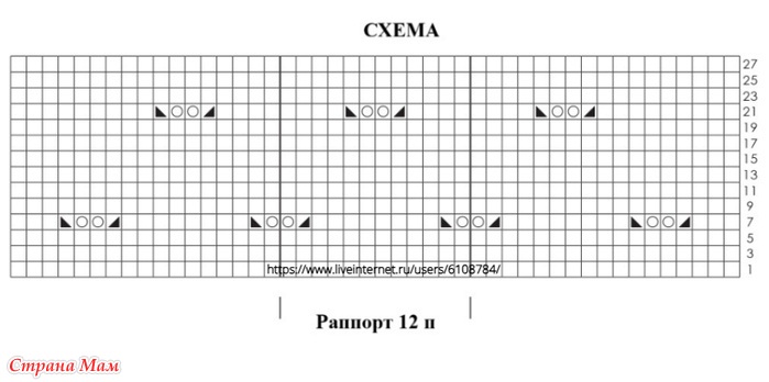 • Ажурный узор: см. схему. На схеме указаны только лицевые ряды. В изнаночных рядах все петли и накиды вязать изнаночными. Начинать с петель, отмеченных для соответствующей детали и размера перед раппортом, затем постоянно повторять раппорт, заканчивать петлями после раппорта, отмеченными для детали и размера.