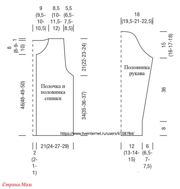 • На общей высоте 55 (57 – 59 – 61) см закрыть оставшиеся 21 (24 – 28 – 32) п. плеча.