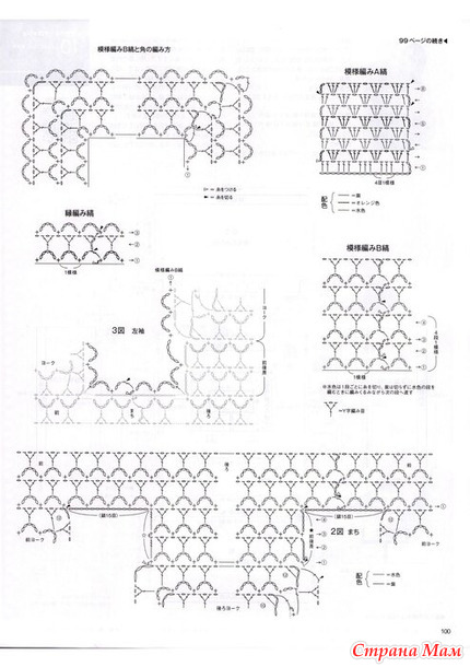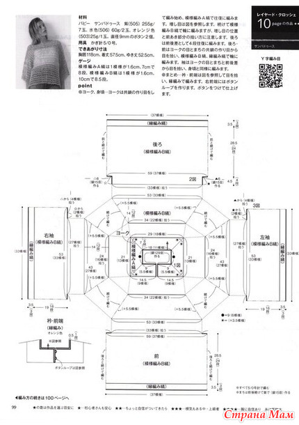 Начните вязание, провязывая лицевыми петлями узорчатую полосу А. Обратитесь к схеме для прибавления петель. Затем вяжите узорчатую полосу В по кругу, обращая внимание на положение прибавляемых петель и способ набора петель в открытой передней части. Для спинки вяжите 4 ряда лицевыми петлями туда и обратно с разницей между передней и задней частью. Для спинки и передней части наберите петли из наборной цепочки петель кокетки и клина, затем вяжите по кругу узорчатой ​​полосой В и кромочным швом. Для рукавов наберите петли из петель кокетки, клина и разницы между передней и задней частью и вяжите так же, как и основную часть изделия.