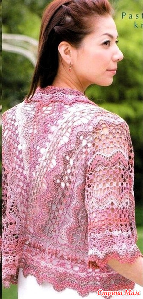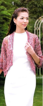 Спинка – настоящий шедевр, с прекрасным узором, созданным многонаправленным вязанием. Этот кардиган-маргаритка с короткими рукавами выполнен из блестящей пряжи с градиентным переходом цвета.
