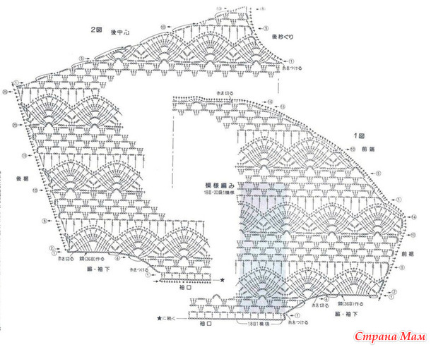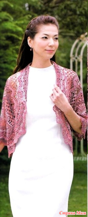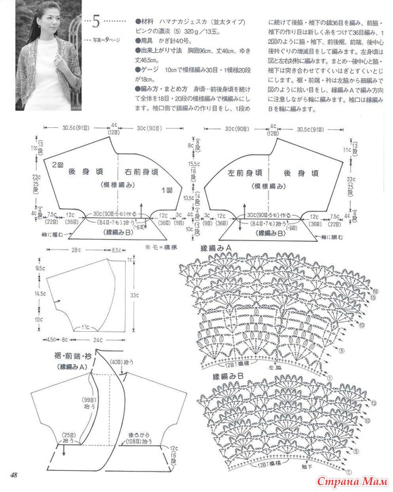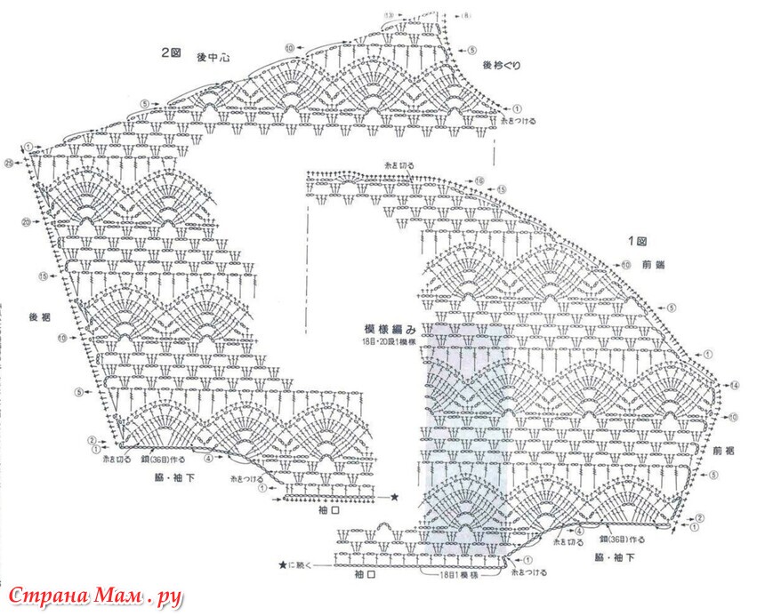 Нижний край, передняя кромка и воротник вяжутся с левой стороны.