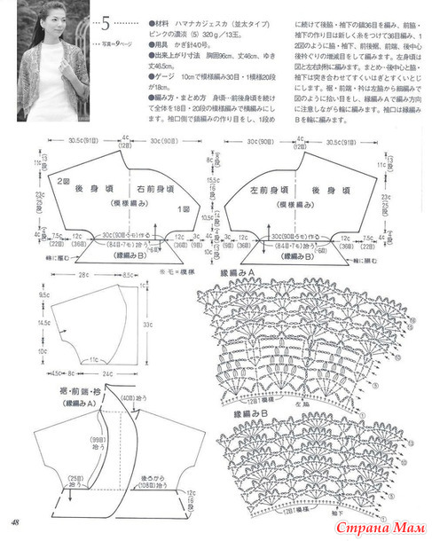 Размеры готового изделия: обхват груди 96 см, длина 46 см, длина рукава 46,5 см.