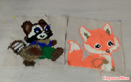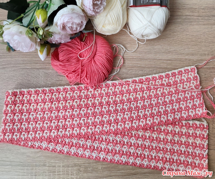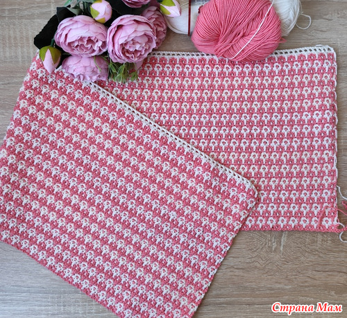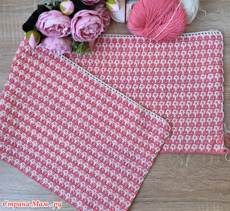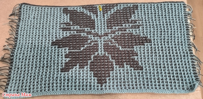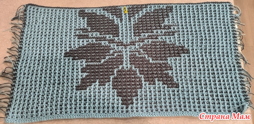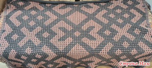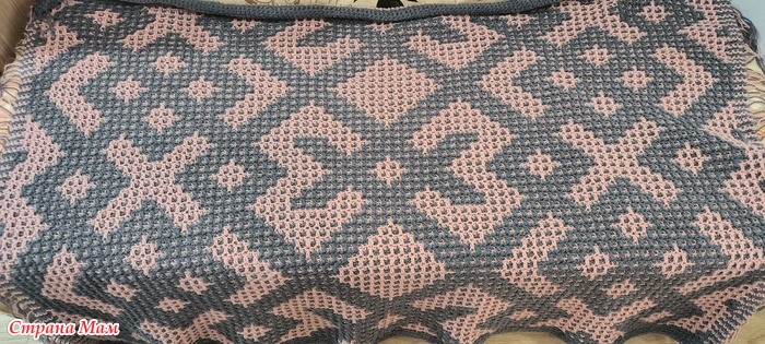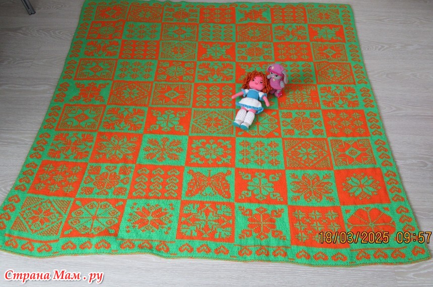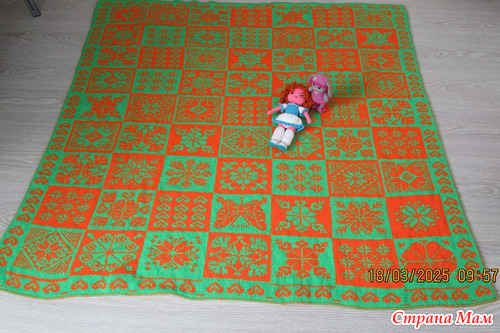 а это недовязанный плед, я его пока сверху симметрично низу обвязала, но как появится время продолжу мозаичным вязанием до полноценной длины 1,8-1,9 м, ширина 1,5 м