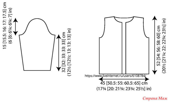 22 п. и 31 р. = 10 х 10 см, узор спицами 3,25 мм.