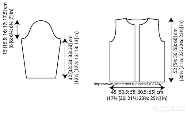 Соблюдая рисунок узора и убавляя п. для горловины, как для пройм, убавить 1 п. со стороны горловины в след. 6 р., затем 4 [4: 5: 5: 6] раза в каждом след. 2-м р., затем 2 раза в каждом след. 4-м р. 19 [21: 23: 27: 29] п.