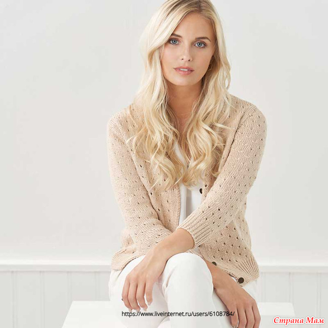 Повседневный кардиган с рукавами три четверти и круглым вырезом горловины, который можно надеть весной поверх платья или топа, выполнен простым нежным узором из дырочек ажура. Кардиган вяжется снизу вверх из отдельных деталей, которые затем сшиваются вместе.