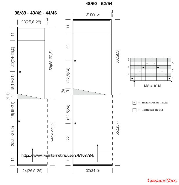 Указания для размеров 40/42, 44/46, 48/50 и 52/54 даны в скобках последовательно, разделены тире. Если указано только одно значение, оно относится ко всем размерам.