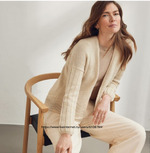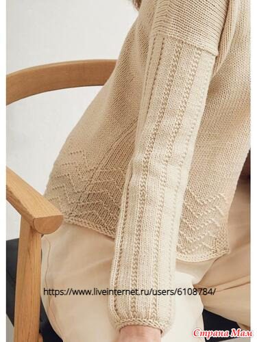 Рукав ¾: (без выкройки) Набрать петли по пройме и вязать по кругу вниз на круговых спицах. С полочек и спинки от * до * равномерно набрать 66 (72 - 78 - 84 - 90) п. (из 3 рядов набирать 2 петли) и вязать резинкой 35 (35 - 33 - 33 - 33) см. В следующем круговом ряду постоянно провязывать по 2 п. вместе лицевой = 33 (36 - 39 - 42 - 45) п., 1 круговой ряд изн. петель, 1 круговой ряд лиц. петель, закрыть все петли лицевыми.