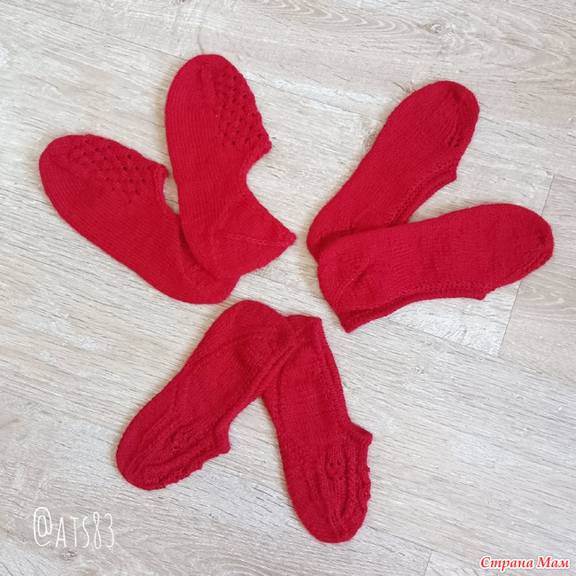 В общем, половину вязала, опираясь на свой опыт, а не на описание. Размер 38.И третья пара по описанию Ирины Решетник, следки Terlichki. Только узор добавила простенький, у автора они просто лицевой гладью связаны. Размер 38, хотя кажутся больше всех. Просто они широкие))