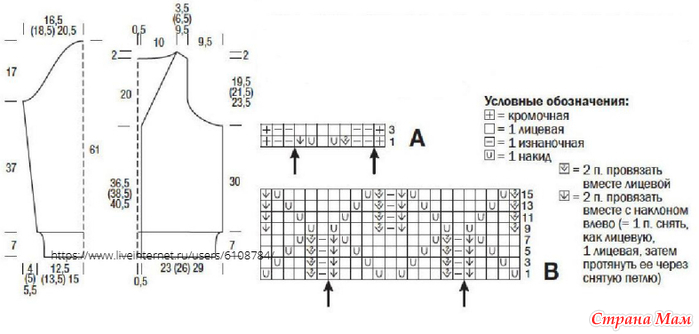 Узор «Ромбы»: количество петель кратно 12 + 11. Вязать по схеме В. На ней приведены только лицевые ряды, в изнаночных рядах петли вязать по рисунку, накиды провязывать изнаночными. Начать с петель перед правой стрелкой, повторять раппорт между стрелками и закончить петлями после левой стрелки. Повторять 1-16-й ряды.