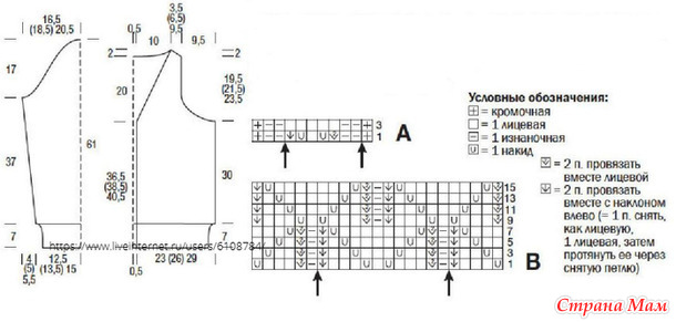 Ажурный узор в рубчик: количество петель кратно 7 + 2 + 2 кромочные. Вязать по схеме А. На ней приведены только лицевые ряды, в изнаночных рядах петли вязать по рисунку, накиды провязывать изнаночными. Начать с петли перед правой стрелкой, повторять раппорт между стрелками и закончить петлями после левой стрелки. Повторять 1-4-й ряды.