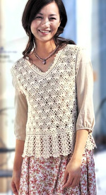 Пряжа используется для однониточного вязания. Для передней и задней частей тела наберите петли воздушной петлей, затем провяжите узором ①, как показано на схеме, и продолжайте от передней части тела до соединения плеч. Зашейте боковые части, поднимите петли с набранных петель до низа и провяжите узором ② по кругу, продолжая для передней и задней частей. Вывяжите горловину и проймы по кругу, используя обвязку.